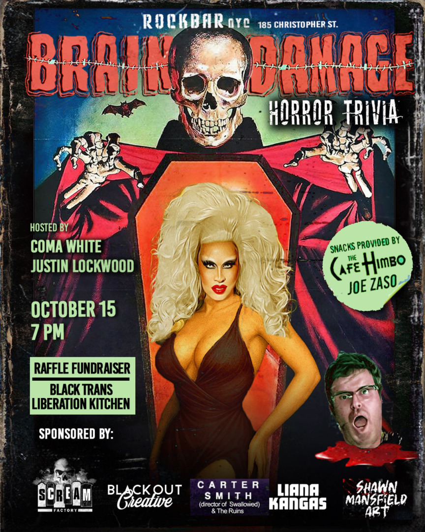 Join hosts Coma White & Justin Lockwood for a frightful night of horror trivia! test your horror movie knowledge and take a stab at winning prizes from this months sponsors: Scream Factory, Blackout Creative, Carter Smith, Liana Kangas and Shawn Mansfield! Snacks by Joe Zaso